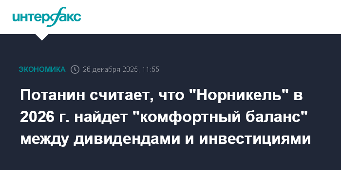 Потанин считает, что "Норникель" в 2026 г. найдет "комфортный баланс" между дивидендами и инвестициями