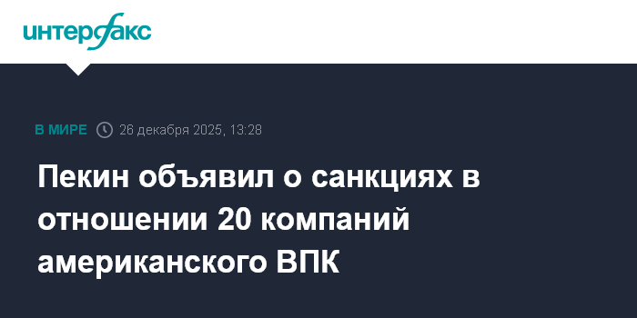 Москва. 26 декабря. INTERFAX.RU - Власти Китая объявили о введении ограничительных мер в отношении 20 американских компаний, связанных с оборонной сферой, сообщили в пятницу в МИД КНР.