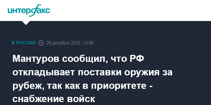 Москва. 26 декабря. INTERFAX.RU - Поставки вооружения и военной техники по экспортным контрактам вынужденно откладываются, в приоритет ставятся поставки в войска, сообщил первый вице-премьер РФ Денис Мантуров.
