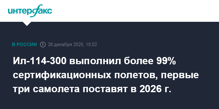 Москва. 26 декабря. INTERFAX.RU - Самолет Ил-114-300 выполнил более 99% сертификационных полетов и в обозримом будущем завершит программу, первые три самолета будут готовы для заказчика в 2026 году, сообщил гендиректор ПАО "ОАК" (входит в "Ростех") Вадим Бадеха в интервью "России 24".