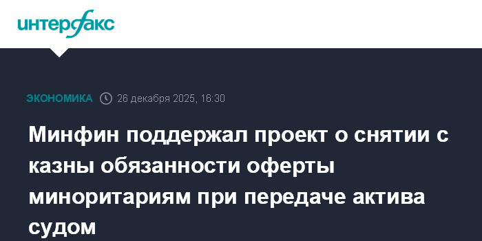 Минфин поддержал проект о снятии с казны обязанности оферты миноритариям при передаче актива судом