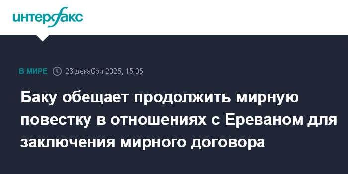 Москва. 26 декабря. INTERFAX.RU - Официальный Баку в 2026 году продолжит шаги в рамках мирной повестки в отношениях с Ереваном для заключения мирного соглашения, заявил министр иностранных дел Азербайджана Джейхун Байрамов.