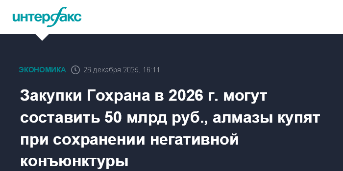 Закупки Гохрана в 2026 г. могут составить 50 млрд руб., алмазы купят при сохранении негативной конъюнктуры