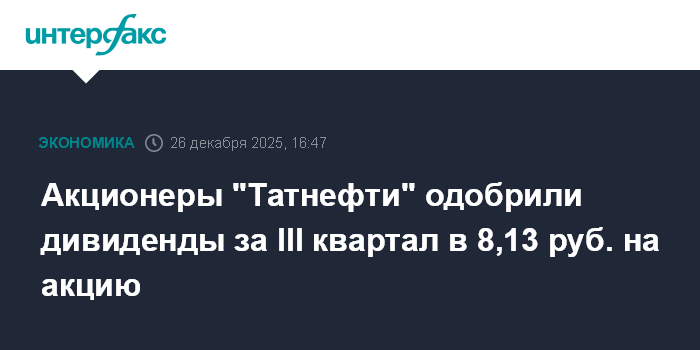 Москва. 26 декабря. INTERFAX.RU - Акционеры ПАО "Татнефть" на прошедшем в заочной форме внеочередном собрании одобрили дивиденды за третий квартал 2025 года в размере 8,13 рубля на акцию, говорится в сообщении компании.