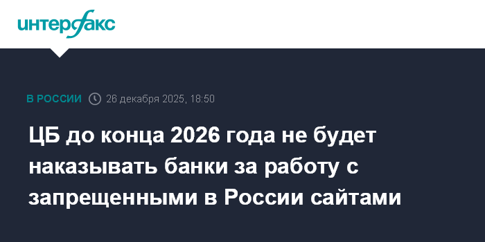 Москва. 26 декабря. INTERFAX.RU - Банк России продлил до конца 2026 года период, в течение которого не будет применять к кредитным организациям меры за нарушение запрета на банковское обслуживание организаций, чьи сайты включены в единый реестр запрещенных в России интернет-ресурсов.