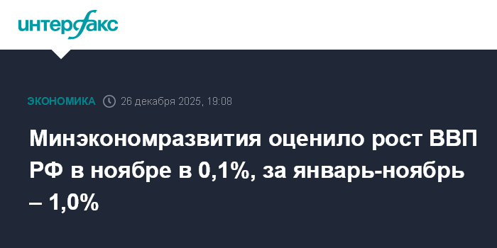 Москва. 26 декабря. INTERFAX.RU - Рост ВВП РФ в ноябре 2025 года, по оценке Минэкономразвития, составил 0,1% в годовом сравнении после повышения на 1,6% в октябре, на 0,9% в сентябре, на 0,4% в августе и в июле, на 1,0% в июне, на 0,7% в мае, на 1,5% в апреле, на 1,1% в марте, на 0,5% в феврале и на 2,7% в январе, говорится в опубликованном в пятницу обзоре министерства "О текущей ситуации в экономике".