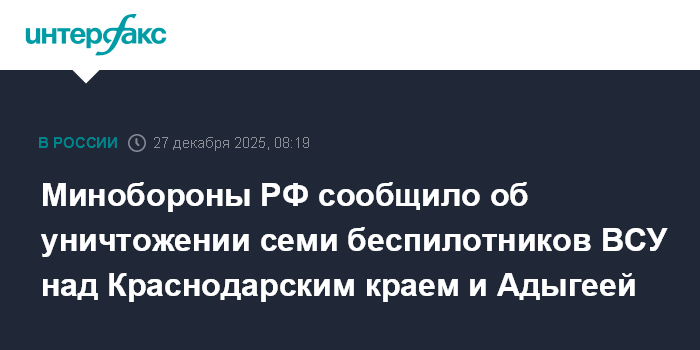 Москва. 27 декабря. INTERFAX.RU - Семь украинских беспилотников уничтожены в течение прошедшей ночи над Краснодарским краем и Республикой Адыгея, сообщило Минобороны РФ.