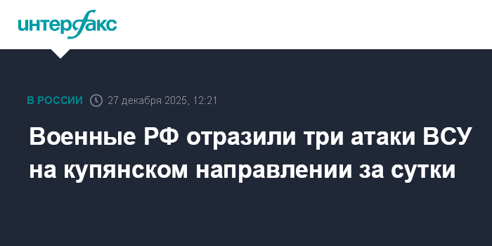 Москва. 27 декабря. INTERFAX.RU - Российские военные на купянском направлении в течение суток отразили три атаки армии Украины с целью прорыва в город Купянск, сообщило Минобороны РФ в субботу.