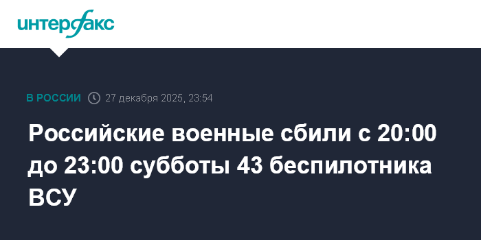 Москва. 27 декабря. INTERFAX.RU - Дежурные средства ПВО уничтожили с 20:00 до 23:00 субботы 43 украинских беспилотника над регионами РФ и Азовским морем, сообщили в Минобороны России.