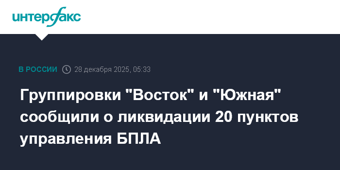 Москва. 28 декабря. INTERFAX.RU - Подразделения группировок "Восток" и "Южная" за сутки уничтожили 20 пунктов управления беспилотной авиацией армии Украины, сообщили в пресс-центрах группировок в воскресенье.