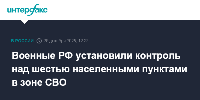 Москва. 28 декабря. INTERFAX.RU - Российские военные установили контроль над шестью населенными пунктами в ДНР и Запорожской области, сообщили в Минобороны РФ в воскресенье.
