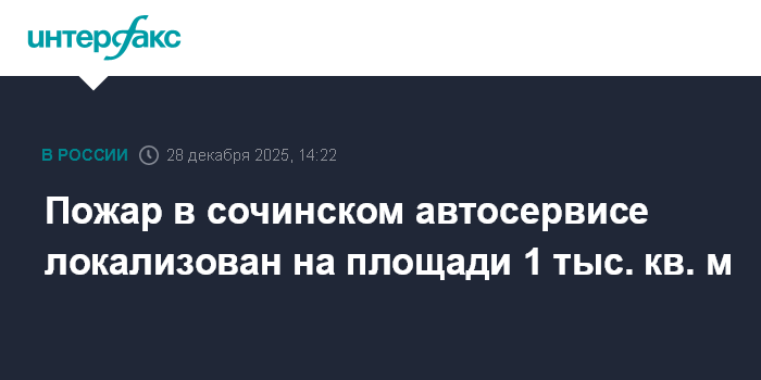 Ранее сообщалось, что в Хостинском районе Сочи возник пожар в здании автосервиса на площади 1 тыс. кв. м. По предварительной информации, пострадал один человек. К тушению пожара были привлечены 34 человека, 12 единиц техники, от МЧС России 22 человека, восемь единиц техники.