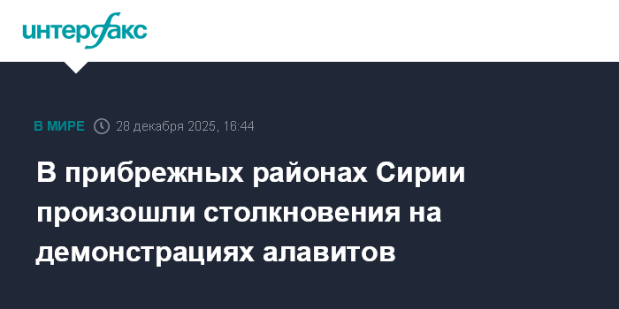 Москва. 28 декабря. INTERFAX.RU - Представители алавитов - религиозного меньшинства Сирии - в воскресенье вышли на акции протеста в прибрежных городах Латакия и Тартус, после чего между демонстрантами и их противниками вспыхнули столкновения, сообщает Associated Press (AP).