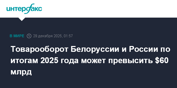 Москва. 29 декабря. INTERFAX.RU - Товарооборот между Белоруссией и Россией за 2025 год растет и может превысить рекордные $60 млрд, заявил посол Белоруссии в РФ Александр Рогожник.