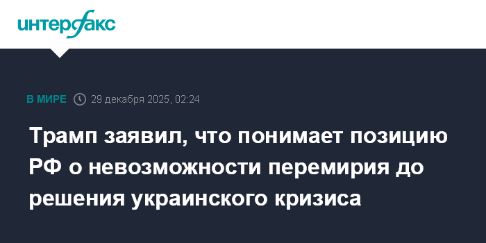 Москва. 29 декабря. INTERFAX.RU - Президент США Дональд Трамп заявил, что понимает позицию РФ о том, что прекращение огня с Украиной невозможно до решения спорных вопросов.