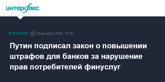 Москва. 29 декабря. INTERFAX.RU - Президент РФ Владимир Путин подписал закон о повышении штрафов для банков за нарушение прав потребителей финансовых услуг.