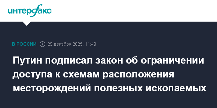 Москва. 29 декабря. INTERFAX.RU - Президент РФ Владимир Путин подписал закон, предполагающий ограничение доступа к специальным картам (схемам) с информацией о месторождениях полезных ископаемых. Соответствующие правки вносятся в статьи 3 и 25 закона РФ "О недрах".