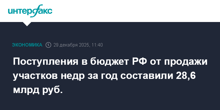 Москва. 29 декабря. INTERFAX.RU - Поступления в бюджет России от продажи участков недр в 2025 году составили 28,6 млрд рублей, прогноз на 2026 год - 20,1 млрд рублей, сообщил в интервью "Интерфаксу" глава Минприроды Александр Козлов.