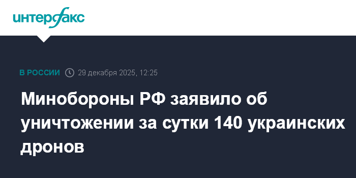 Москва. 29 декабря. INTERFAX.RU - Российские военные за сутки ликвидировали более 140 воздушных целей, сообщило Минобороны РФ.