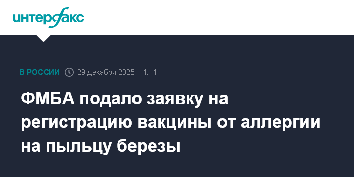Москва. 29 декабря. INTERFAX.RU - Федеральное медико-биологическое агентство (ФМБА) России подало заявку на регистрацию вакцины для профилактики аллергии на пыльцу березы, сообщила руководитель агентства Вероника Скворцова.