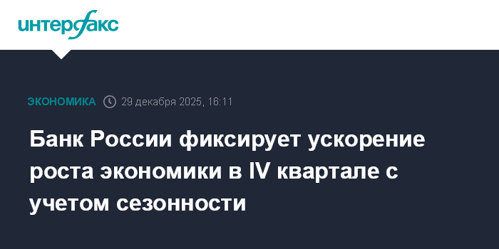 Москва. 29 декабря. INTERFAX.RU - Банк России на основе оперативных данных фиксирует ускорение роста российской экономики в IV квартале 2025 года, говорится в резюме обсуждения ключевой ставки на декабрьском заседании совета директоров ЦБ.