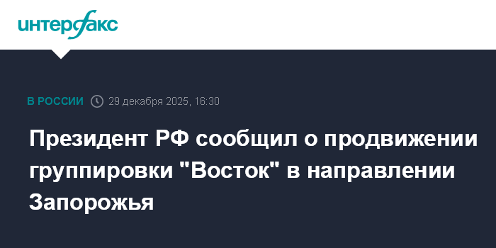 Москва. 29 декабря. INTERFAX.RU - В зоне группировки "Восток" ситуация развивается благоприятно, войска хорошим темпом двигаются в направлении Запорожья, заявил президент РФ Владимир Путин.