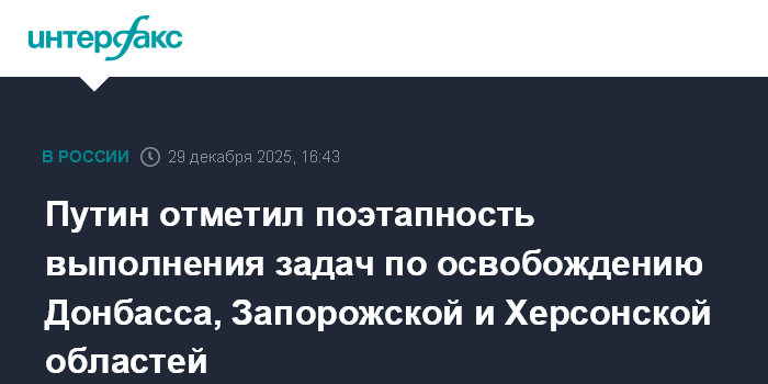 Москва. 29 декабря. INTERFAX.RU - Президент России Владимир Путин заявил, что освобождение Донецкой и Луганской Народных Республик, Запорожской и Херсонской областей идет в соответствии с планом СВО.