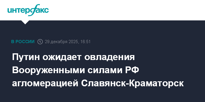 Москва. 29 декабря. INTERFAX.RU - Освобождение Северска и эффективная работа в городе Константиновка позволяет создать условия для овладения Вооруженными Силами РФ Славянско-Краматорской агломерацией, заявил президент РФ Владимир Путин.
