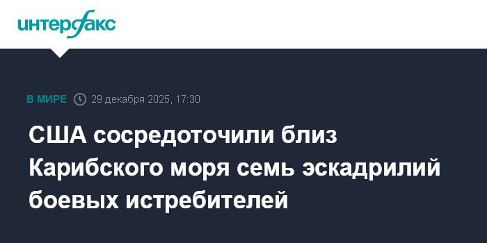 Москва. 29 декабря. INTERFAX.RU - Соединенные Штаты развернули на базах и кораблях в регионе Карибского моря семь эскадрилий боевых истребителей общим количеством примерно 78 самолетов, а также крупную группировку тяжелых ударных беспилотников, сообщают американские СМИ.