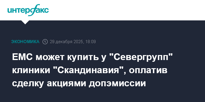 Как сообщает EMC, акции могут быть оплачены деньгами и/или долями участия в уставном капитале ООО "Ава-Петер" (юрлицо сети клиник "Скандинавия"), принадлежащего "Севергрупп".