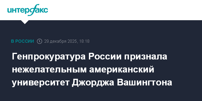 Москва. 29 декабря. INTERFAX.RU - Генпрокуратура России признала нежелательной для России деятельность The George Washington University, сообщает надзорное ведомство.