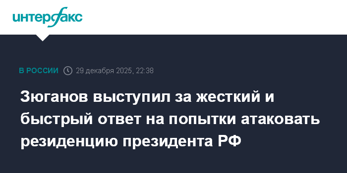 Москва. 29 декабря. INTERFAX.RU - Председатель ЦК КПРФ Геннадий Зюганов выступил за оперативный и жесткий ответ на попытки Украины атаковать резиденцию российского президента.