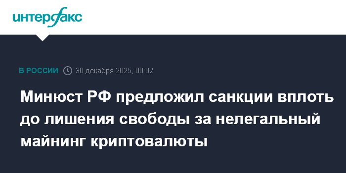 Москва. 30 декабря. INTERFAX.RU - Минюст России предложил наказывать за нелегальный майнинг криптовалюты штрафом до 1,5 млн рублей либо двумя годами принудительных работ, а при получении особо крупного дохода или в составе организованной группы - лишением свободы до пяти лет.