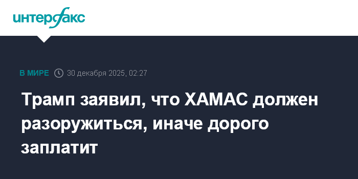 Москва. 30 декабря. INTERFAX.RU - Президент США Дональд Трамп заявил, что если палестинское движение ХАМАС не разоружится в отведенный срок, то дорого заплатит.