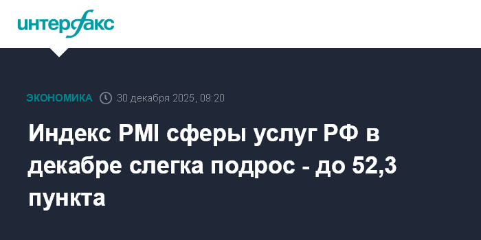 Москва. 30 декабря. INTERFAX.RU - Индекс PMI сферы услуг России в декабре 2025 года составил 52,3 пункта, чуть поднявшись с 52,2 пункта месяцем ранее, по данным S&P Global.