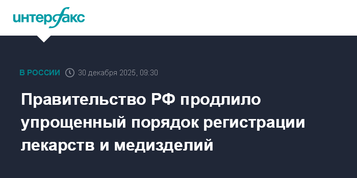 Москва. 30 декабря. INTERFAX.RU - Правительство России продлило действие упрощенного порядка государственной регистрации отдельных лекарственных препаратов до 1 января 2036 года, сообщили в пресс-службе кабмина.