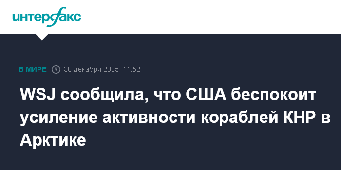 Москва. 30 декабря. INTERFAX.RU - В Вашингтоне встревожены расширением масштабов действий кораблей и научно-исследовательских судов Китая в Арктике, сообщает издание The Wall Street Journal (WSJ).