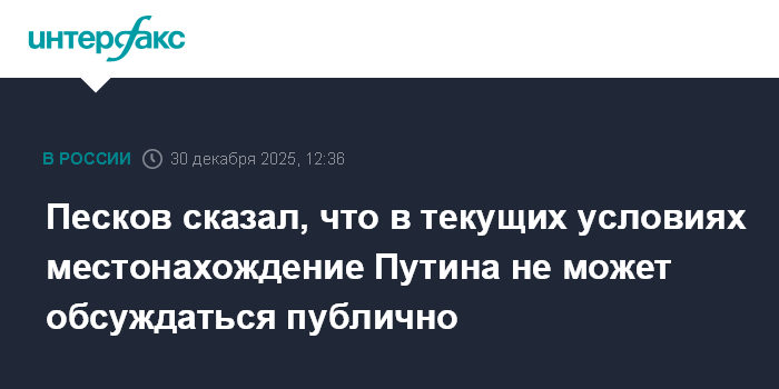 Москва. 30 декабря. INTERFAX.RU - В нынешних условиях вопрос о текущем местонахождении главы государства не подлежит публичному обсуждению, заявил пресс-секретарь президента РФ Дмитрий Песков.