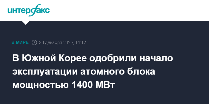 Москва. 30 декабря. INTERFAX.RU - Комиссия по ядерной безопасности и защите Южной Кореи одобрила начало эксплуатации атомного блока мощностью 1400 МВт, строительство которого длилось почти десять лет.