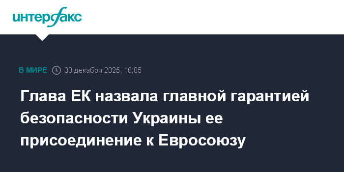 Москва. 30 декабря. INTERFAX.RU - Председатель Европейской комиссии (ЕК) Урсула фон дер Ляйен видит ключевую гарантию безопасности Украины в ее членстве в ЕС.
