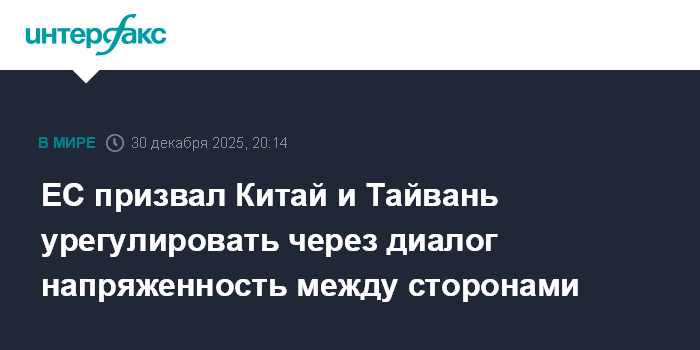 Москва. 30 декабря. INTERFAX.RU - Военные учения Китая близ Тайваня еще больше усиливают напряженность между двумя сторонами пролива и ставят под угрозу международный мир и стабильность, заявили в ЕС.