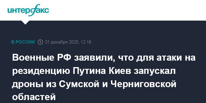 Москва. 31 декабря. INTERFAX.RU - Украина для атаки на резиденцию президента РФ в Новгородской области 28-29 декабря применила беспилотники дальнего действия на предельно малых высотах, они были запущены с территории Сумской и Черниговской областей, заявил в среду начальник зенитных ракетных войск ВКС России генерал-майор Александр Романенков.