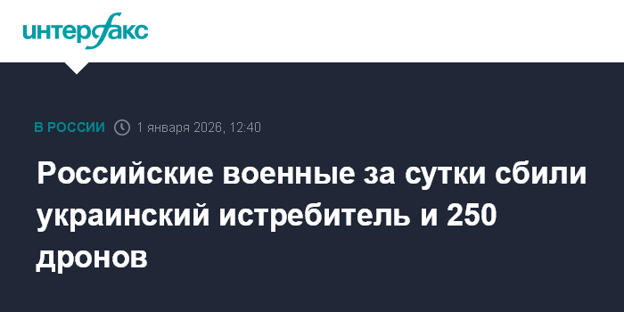 Москва. 1 января. INTERFAX.RU - Российские военные за сутки сбили украинский истребитель Су-27 и 250 дронов самолетного типа, сообщило Минобороны РФ в четверг.