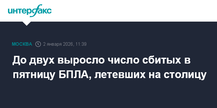 Москва. 2 января. INTERFAX.RU - Мэр Москвы Сергей Собянин сообщил об одном сбитом БПЛА, летевшем в направлении столицы; общее число сбитых беспилотников с полуночи второго дня 2026 года выросло до двух.