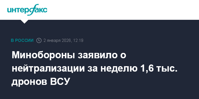 Москва. 2 января. INTERFAX.RU - Российскими военными за неделю сбиты более 1,6 тыс. украинских беспилотников, заявило Минобороны РФ в пятницу.