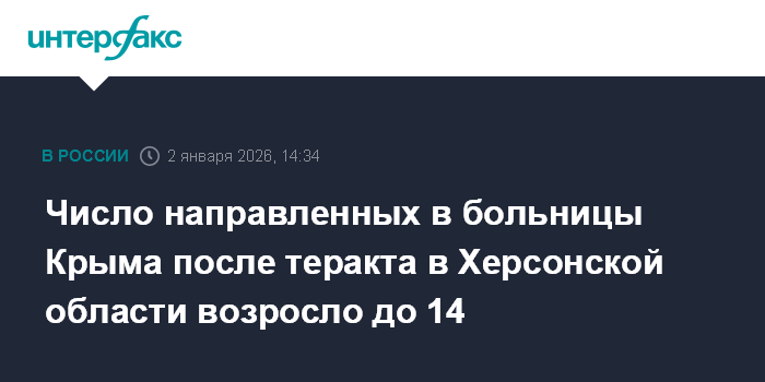 Москва. 2 января. INTERFAX.RU - Число пострадавших при теракте в Херсонской области и направленных на лечение в Крым возросло до 14, сообщила пресс-служба Минздрава республики в пятницу.