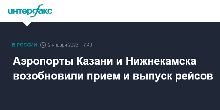 Москва. 2 января. INTERFAX.RU - Аэропорты Казани и Нижнекамска возобновили работу после снятия вводившихся ограничений, сообщил представитель Росавиации Артем Кореняко в своем телеграм-канале.