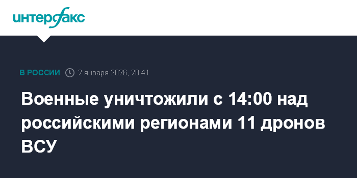 Москва. 2 января. INTERFAX.RU - Российские военные с 14:00 до 20:00 пятницы нейтрализовали 11 украинских беспилотников, заявило Минобороны РФ.