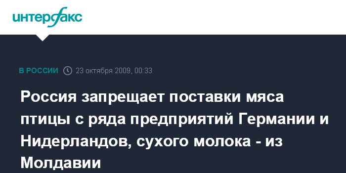 Москва. 23 октября. ИНТЕРФАКС - Россия с 23 октября запрещает поставки мяса птицы с ряда предприятий Германии и Голландии, сухого молока - с молдавского АО "Инкомлак".