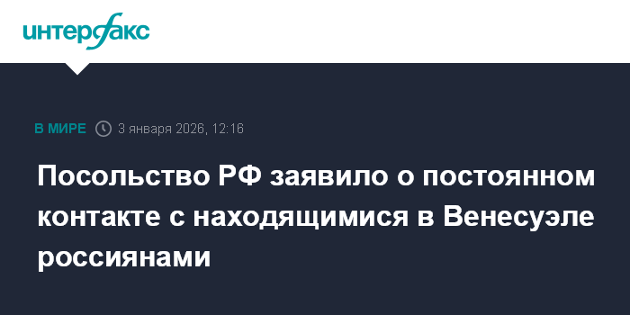 Москва. 3 января. INTERFAX.RU - Посольство РФ в Каракасе находится в постоянном контакте с властями Венесуэлы и гражданами РФ, находящимися на территории страны, заявили в субботу в российской дипмиссии.